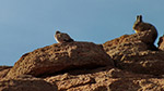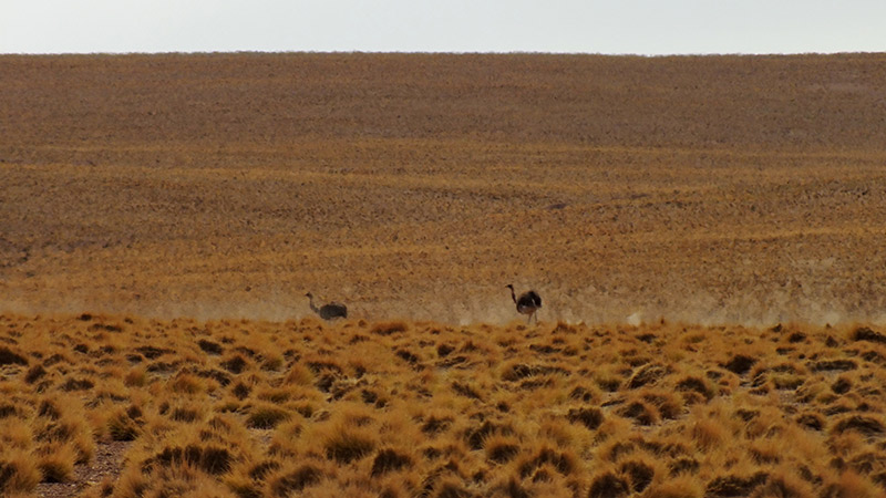 In einiger Entfernung sehe ich drei schwarze Punkte in der Landschaft: Nandus! Ihre Spuren hatte ich schon die ganze Zeit im Sand der Piste gesehen. Ich versuche, noch etwas näher ran zu fahren, aber als ich die Kamera dann ausgerichtet habe, laufen sie davon. Lediglich die Viscachas und auch die Felshühner kann ich in Ruhe fotografieren. Sie sitzen auf den vom Wind gerundeten Felsen und genießen die Wärme der ersten Sonnenstrahlen. Im Laufe des Tages sehe ich dann auch noch einige Vicunias, die hier heimische wilde Lama-Art. Sie sind aber recht scheu, und nur selten gelingt es mir, so nah heranzukommen, dass ich sie auch fotografieren kann.