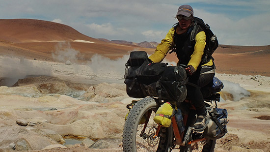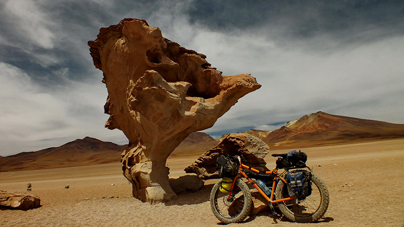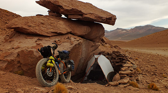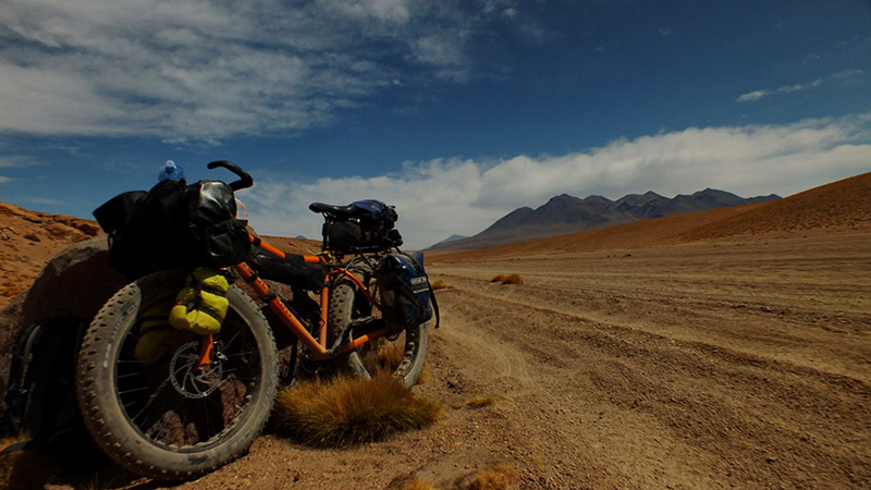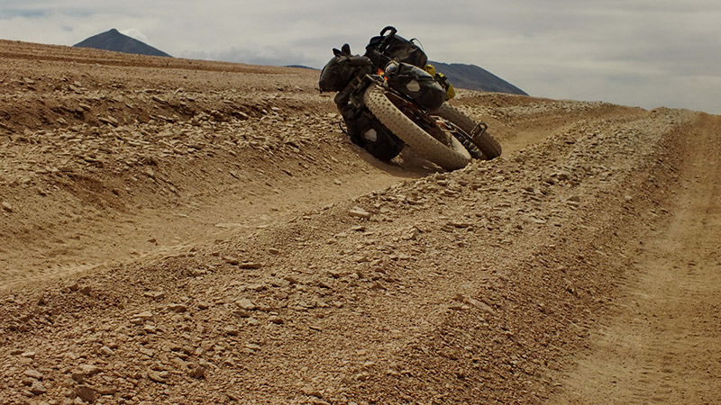 Nachtrag: Am nächsten Morgen überholt mich ein Motorradfahrer. Ein Kanadier, der mit seiner Honda bis nach Ushuaia fahren möchte. Er berichtet, dass er auf der sandigen Etappe massive Probleme hatte und neidisch auf die Spuren meines Fatbike schaute. So scheinbar mühelos, wie ich Spuren wechseln konnte und mir auch neben der Piste eine Route erschließen konnte, ging es für ihn mit dem schweren Motorrad nicht. 20 mal sei er gestürzt... Auch andere Motorradfahrer, die ich später in Uyuni traf, bewunderten immer das leichte, geländegänige Fatbike, das immerhin deutlich breitere Reifen hat, auch als die Geländemotorräder.