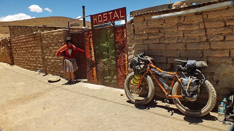 Als ich schließlich in Quetena Chico mein Fahrrad im Innenhof des Hostals parke, zeigt das Thermometer 53°C an, und der Tacho 730 Höhenmeter auf 47 Kilometern.