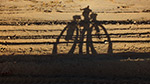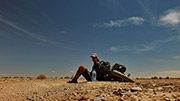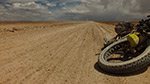 Zum Glück scheint der stärkste Sandsturm vorbei zu sein, so dass ich mich dann doch wieder auf die Piste wage. Nach dem entspannten Fahren auf der Nebenpiste ist das jetzt eine Qual. Doch ich bemerke zu meiner Erleichterung, dass das Fatbike ideal ist für diese staubige Sand/Mehl-Passagen. Es „schwimmt“ geradezu obenauf, ich sinke kaum ein, und mit etwas Geschick und Kraft kann ich mich auch durch längere Mehlpassagen fahrend durcharbeiten. Der dicke Reifen produziert dabei jedoch auch eine ansehnliche Staubwolke, die alles, auch meine Beine mit einer weißen, feinen Staubschicht bedeckt. Ich setze also alles daran, wieder einen Zeltplatz mit Wasser am Fluss zu finden, denn ohne Wasser kann ich diese Staubschicht nicht mehr abbekommen…