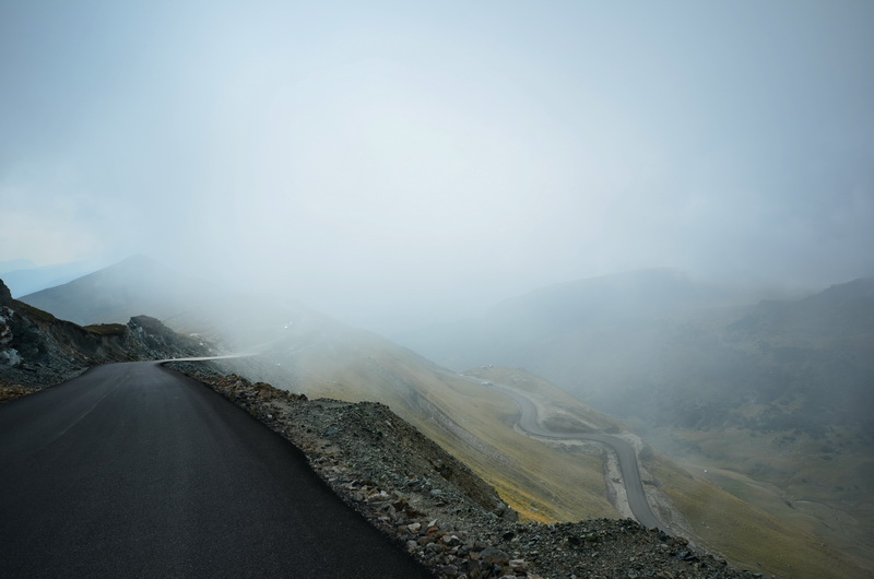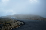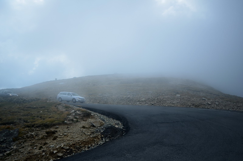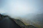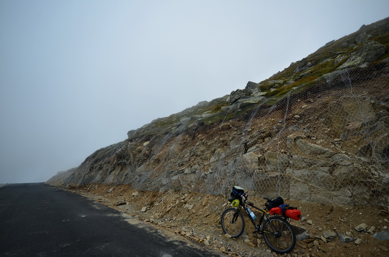 Die Abfahrt vom Zwischenpass ist gespenstisch: Auf einem schmalen Grat schießt die Straße (ohne Leitplanke!) gerade bergab, bevor sie sich dann in zwei großen Serpentinen in einen Sattel hinab windet. Von dort geht es dann in sehr engen, steilen Serpentinen zur eigentlichen Passhöhe. Diese ist jedoch enttäuschend: Kein Schild oder irgend ein offizieller Vermerk. Schade irgendwie. Platz für die Verkaufsbuden wäre hier auch nicht. Ich warte ein wenig, ob sich der Nebel nicht doch noch verziehen möchte, beschließe dann aber, auch weil es zu kühl wird, mich an die Abfahrt zu machen.