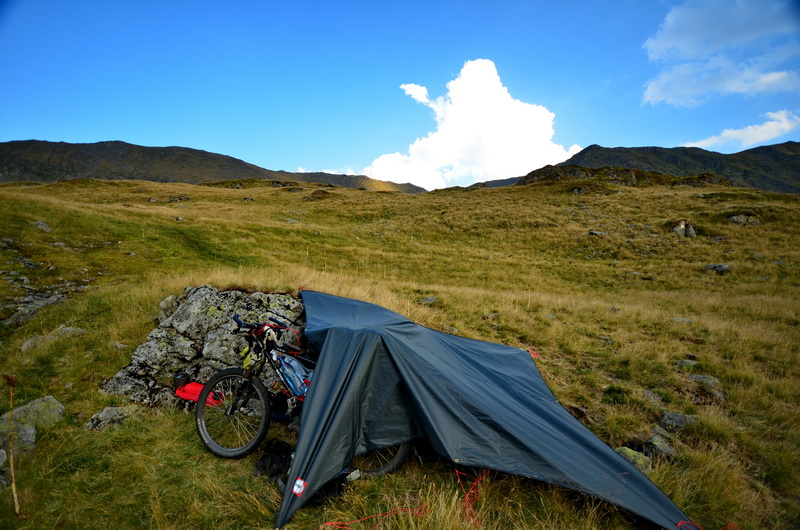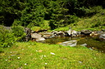 Am See erfahre ich zunächst einige Enttäuschungen: erstens, es ist ein Stausee mit sehr niedrigem Wasserspiegel und es ist nahezu unmöglich über das steile frei gelegte Ufer zum Wasser zu kommen (also nichts mit Baden...). Zweitens ist das Westufer total trocken, all die zufließenden Bächlein führen jetzt im Spätsommer kein Wasser. Ich muss noch mindestens 10 Kilometer weiter fahren, bis ich endlich einen wasserführenden Bergbach finde, und damit das notwendige Wasser für den Abend auffüllen kann.
