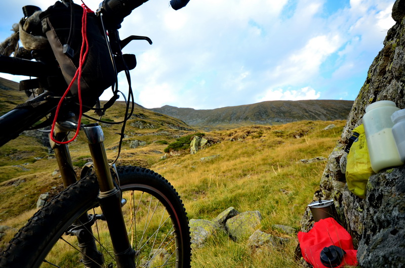 Ich beschließe dem Wanderpfad auf den Moldoveanu zu nehmen (mit den gelben Dreiecken als Markierung). Das Fahrrad führe ich zunächst schiebend und tragend mit, in der Hoffnung zumindest auf dem Rückweg einige schöne Trails fahren zu können. Aber letztendlich stellt sich heraus, dass es, ungleich zu den Alpen, hier keine vernünftig gebauten Wanderwege gibt, sondern nur Wegmarkierungen. Jeder der Wenigen, der hier geht, sucht sich offensichtlich seine Spur selber, und die vorhandenen Spuren sind vor allem durch Schaftritte viel zu schmal und zu tief zum radfahren. Eigentlich toll, aber an radeln ist hier eben nicht zu denken...