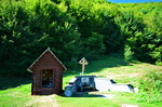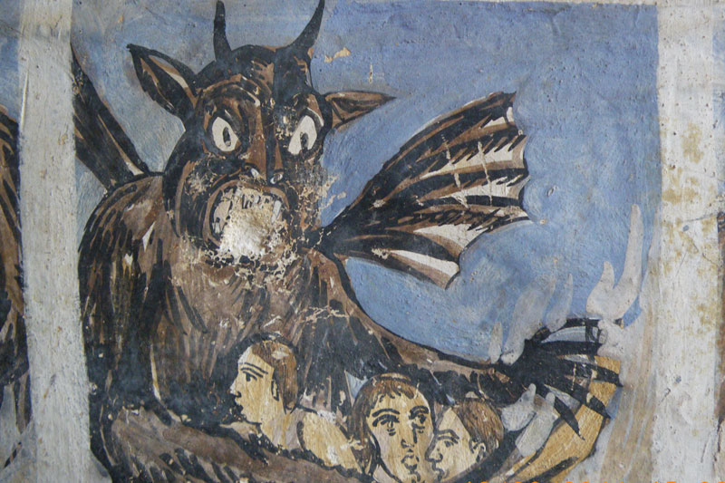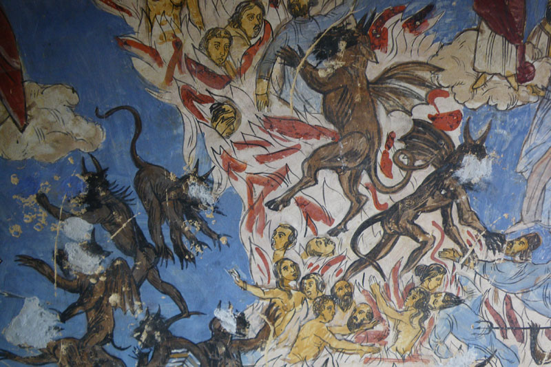 An einer kleinen Kapelle kurz nach einer Passhöhe zwischen den Dörfern Perisani und Salatrucu mache ich kurz Rast und genieße die Aussicht ins Tal. Die Malereien in der Kapelle sin auch sehr eindrucksvoll: In einer Art Bildergeschichte wird das fromme Leben erklärt, bzw. die 'Konsequenzen' des nicht-christlichen Lebens drastisch dargestellt. Irgend jemand hat den meisten Teufelchen auch schon die Gesichter weggekratzt.