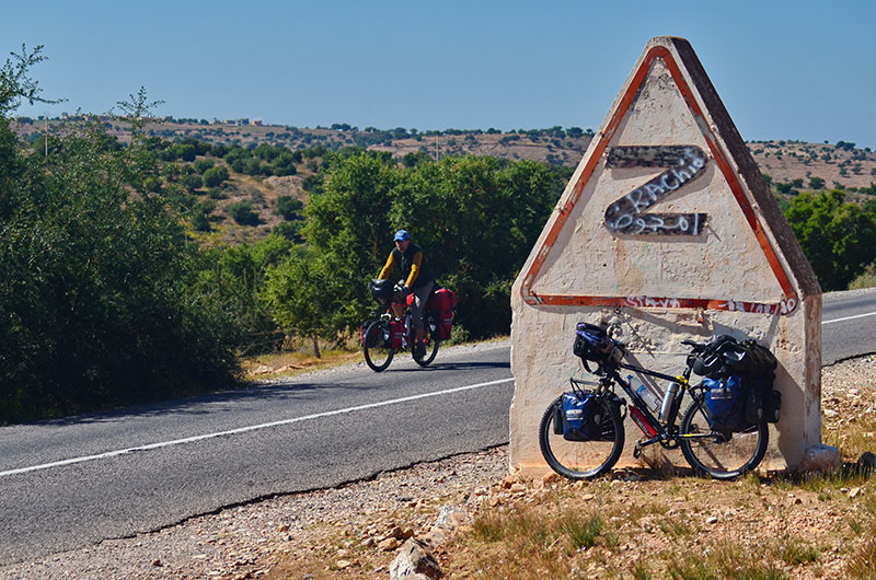 Über Biougra radeln wir hinauf nach Ait-Baha. Sehr schöne Panorama-Straße, mit Blicke auf den verschneiten Hohen Atlas im Norden. Von Ait-Baha geht es dann auf die landschaftlich hübsche Straße entlang/oberhalb des Flusstals des Ait-Baha. Es ist ein kleines Sträßchen mit welligem Profil, tendenziell bergauf, aber immer wieder mit grandiosen Blicken in das Tal. Die Vegetation ist dominiert von Arganien-Bäume und diverse sukkulente Euphorbia-Gewächse.