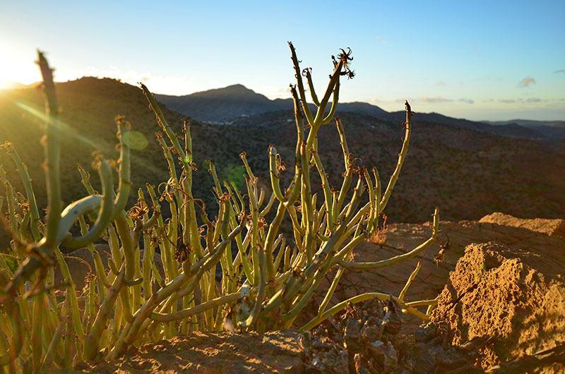 Auf der Strecke gibt es wenige Möglichkeiten, Wasser aufzufüllen. Die Sonne scheint intensiv und bei dem leichten Rückenwind kühlt uns der Fahrtwind nicht besonders. Dementsprechend sind wir froh, nach mehreren Stunden des sorgsamen Einteilens der Wasserreserven, endlich einen Brunnen in der Nähe einer Ortschaft zu finden. Wir füllen gleich die Wassersäcke auf und sind damit unabhängig. Nach einer weiteren Radelstunde finden wir einen schöneren Zeltplatz zwischen Felsen und Sukkulenten.