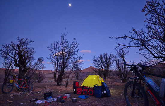 Bei wolkenlosem Himmel erleben wir hier die kälteste Nacht der Tour, Zelt und Taschen sind am nächsten Morgen mit Raureif bedeckt...