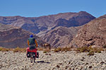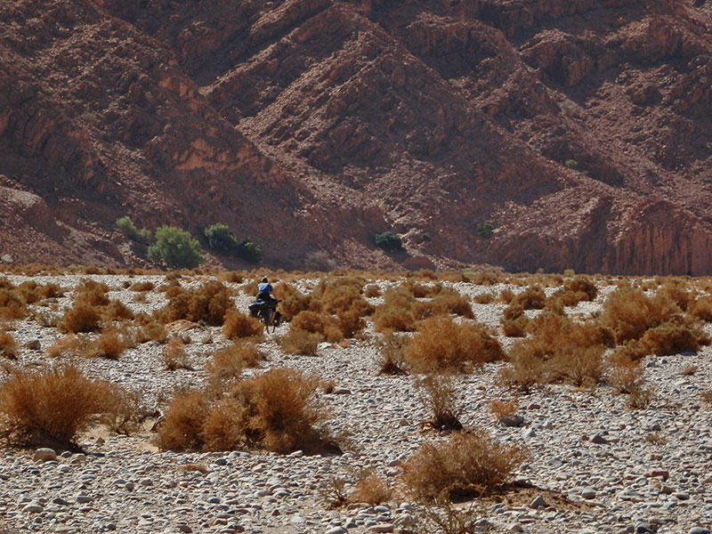 Etwa bei den letzten Häusern der Ortschaft (auf der linken Straßenseite) zwischen den Palmen versteckt führt eine kleine Piste gerade nach Süden. Der Einstieg ist extrem holprig und über große Flusskiesel, später wird es deutlich besser fahrbar. Für etwa 45 km sind wir nun alleine.