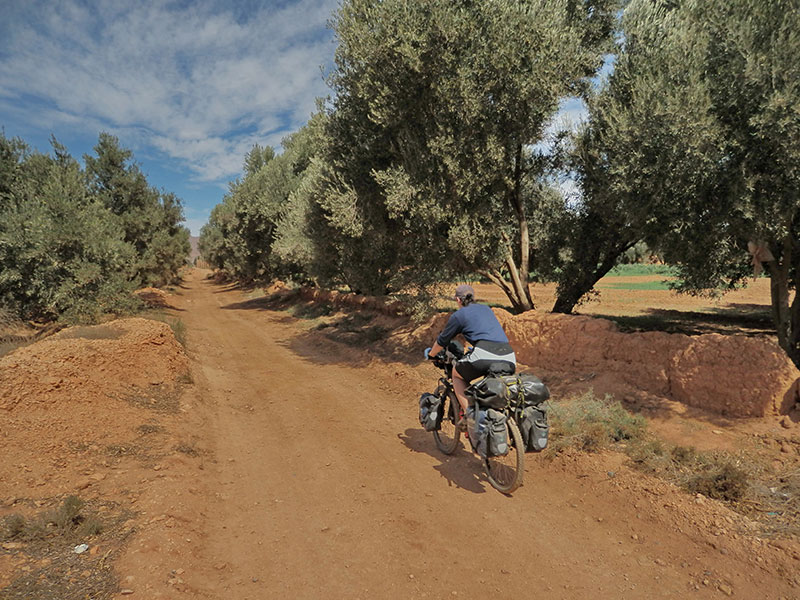 Irgendwann kommen wir an bestellten Äckern und kaputten Brunnen vorbei. Erst als wir auf einem kleinen Hügel ankommen und die Siedlungen Asrir (links) und Fask (rechts), sowie die Asphaltstraße weit vor uns sehen, folgen wir einer Spur nach rechts in Richtung Fask. So kommen wir an einem Fluss mit stehenden Restwasser-Tümpeln und an einer großen Oliven-Plantage vorbei, bevor wir kurz vor Fask wieder den Asphalt berühren.