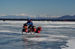 Our daily mileage varied from 25 kilometers to 55 kilometers depending on ice and snow conditions. Best cycling conditions we found south of Ust Bargusin and near Olchon Island, where there was almost no snow cover on the lake and we were able to cycle on blank ice in any direction. For that, our bikes were equipped with studded tires, which gave us good grip even on blank ice surfaces. These days with riding on the blank ice were pure joy and gave us a great feeling of freedom.