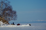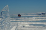 After stocking up with food and fuel in Ust Bargusin we again crossed the lake towards Olchon Island. For this distance of about 150 kilometers we needed a bit more than two days on very good ice conditions. Only three major cracks stopped our riding speed, but it was easy to push the bikes over. Cracks appear and move and one never knows how far away from the tent new cracks will open during the night. As we approached Olchon Island, two fishermen approached us with their car, asking where we were cycling from. They almost did not believe we were cycling over from Ust Bargusin. We were again judged with similarly astonishing looks as we entered the guest house in Chushir, where we again stocked up on food and fuel.