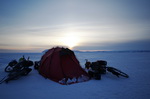 Another challenge we faced each day was the task of finding a suitable spot for pitching our tent at night. Our first night on the lake was rather unpleasant as we were constantly wakened by the cracking and snapping sounds of the ice beneath us. Sometimes it reminded us of thunders and earthquakes which moved through the ice below us. Although the lake is frozen with a thick layer of ice, some sections of the ice are in constant movement. Especially during low night temperatures, cracks appear and move and one never knows how far away from the tent new cracks will open. So we quickly learned where to find "quiet" zones on the ice or we simply pitched our tent on the shore of the lake. A good night's rest was vital for us, as we were active basically from sunrise to sunset every day.