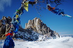 From Chushir we again cycled to the North Cape of Olchon Island and then followed the lonely East coast. This part of the trip was particularly impressive. We enjoyed the remote shore landscape and the almost blank ice conditions for cycling. On this section we did not meet any other humans, but saw many tracks of wolves. We then continued on along the West coast of Lake Baikal towards Listvianka. Again this section was very diverse and attractive with its steep cliffs and ice-covered rocks. From Bolshoje Goloustnoje on we sometimes met other people on the lake, such locals with their cars, and some other tourists who were hiking on the ice. In these cases, we were then seen as an attraction for them.