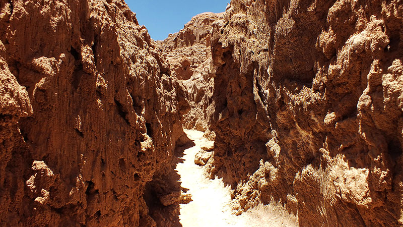 Längst schiebe ich die steilen Anstiege über die Cordelliera del Sal, das Salzgebirge. Es sind spitze Lehmberge, durchzogen mit Gips und Kreideadern. Es sind zwar insgesamt nicht mehr als 300 Höhenmeter zu bewältigen, aber mein Körper ist die unglaubliche Trockenheit nicht gewöhnt, und so fühle ich mich mit jedem Atemzug wie ausgedörrt. Mein Getränkevorrat schwindet.