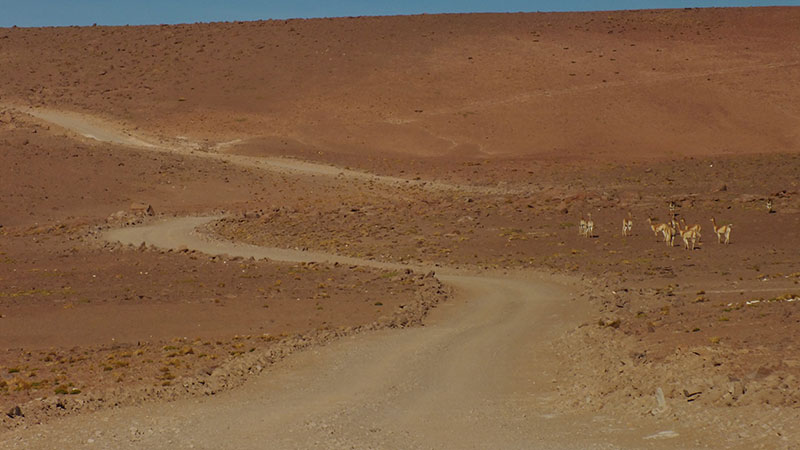 Schließlich verlasse ich den windgeschützten Zeltplatz an der Laguna Lejia und mache mich auf zurück nach San Pedro der Atacama. Der Wasservorrat geht zuende, der Proviant ist fast aufgegessen und damit ist meine Zeit auf dem Hochland auch vorbei. Es beginnt mit einem etwa Anstieg von etwa 100 Höhenmeter, aber alles fahrbar. Wie zum Abschied steht eine Herde Vicunias direkt am Weg. Als ich die Anhöhe erreicht habe, freue ich mich auf eine gemütliche Abfahrt. Aber weit gefehlt…