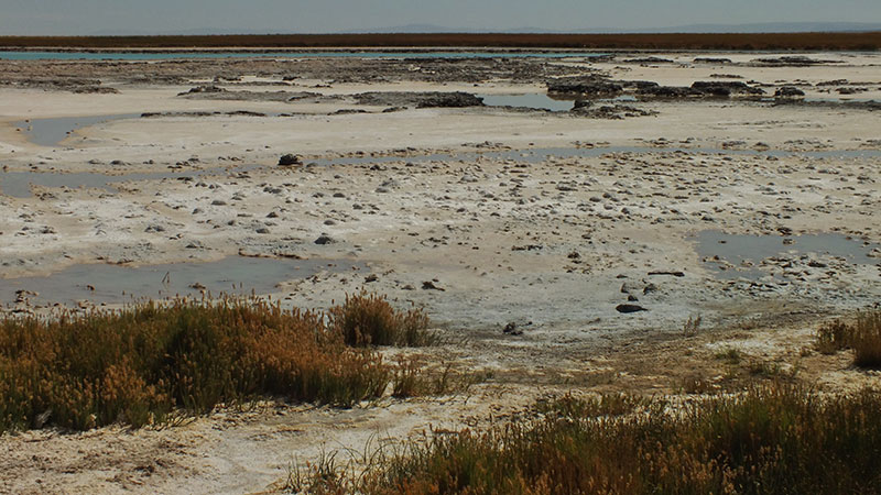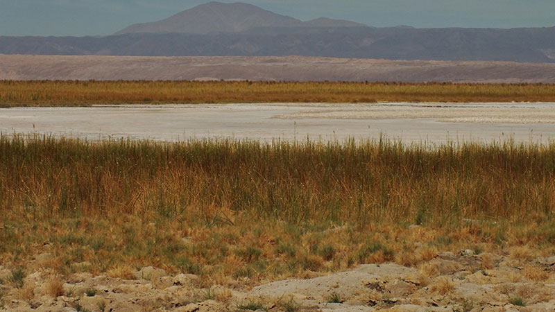 Die Nacht war nicht gut. Zu warm, das bin ich nicht mehr gewöhnt… Als ich aufbreche fühle ich mich unausgeruht, aber mit jeder Pedalumdrehung wird es besser. Die Teerstraße ist mir zu monoton, so beschließe ich einen Umweg über den Salar de Atacama zu machen und dabei auch die Lagunen im Salar zu besuchen. Es ist im Wesentlichen eine flache Strecke auf sehr gut fahrbaren Salzpisten. Ich lasse mir Zeit. Ein kurzes Bad in den Ojos del Salar erfrischt etwas und an der Laguna Cejar bin ich überrascht über die grünen Wiesen, die sich rund um die Seen entwickelt haben.