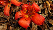 Am nächsten Morgen beginnt meine Radtour nach Überquerung des Mekong mit einem etwa 500 Höhenmeter langen Anstieg direkt aus Jinghong raus. Was für ein Einstieg… Der Verkehr ist zwar ok, die Straße ist breit genug und zusätzlich mit breitem Randstreifen ausgesattet, aber es ist durch die nahe Autobahnbaustelle extrem staubig. Immer wieder bieten sich jedoch Ausblicke auf den Regenwald. Einige Bäume blühen, die Blüten in satten Farben: rot, orange, weiss. Viele dieser Bäume werden nicht von Insekten, sondern von Fledermäusen oder Vögeln bestäubt. Blüten werden hier in Yunnan aber auch gerne gegessen...