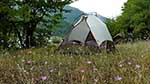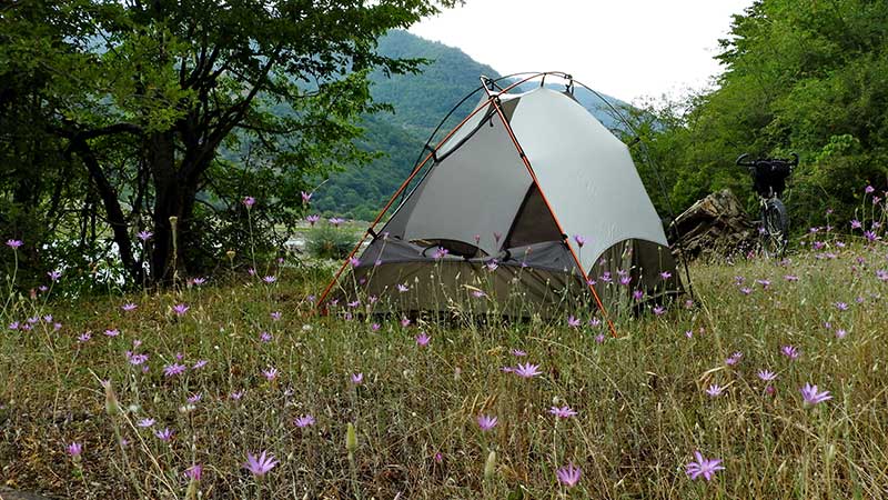 Bei der Festung Anauri lege ich eine kurze Pause ein und schaue die Kirche mit Wehrturm an. Die Anlage liegt oben am Ufer eines großen Stausees. Ein paar Kilometer hinter Anauri finde ich meinen ersten, sehr schönen Zeltplatz am Ufer des Aragvi auf einer kleinen Blumenwiese.