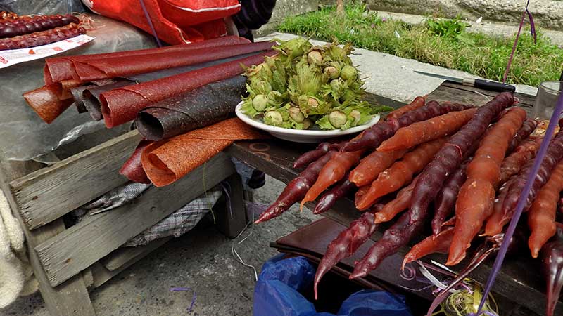 Ich verlasse die georgische Heerstraße und biege auf eine kleine Piste nach Osten ab, die zum Dorf Juta führt. Nach Westen öffnet sich ein schöner Blick auf den Kasbek. Der ist definitiv etwas für das nächste Mal... Die Straße ist gut, wird ab dem Dorf Sno zu einer ganz passablen Piste entlang eines Flusses. Dann aber, als es entlang eines engen Tals hoch nach Juta geht, muss ich des öfteren schieben, weil die Piste zu steil wird. Es ist viel zu heiß, und in Juta bin ich ziemlich fertig. Übernachte in einem Haus.
