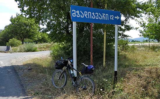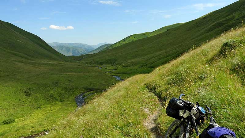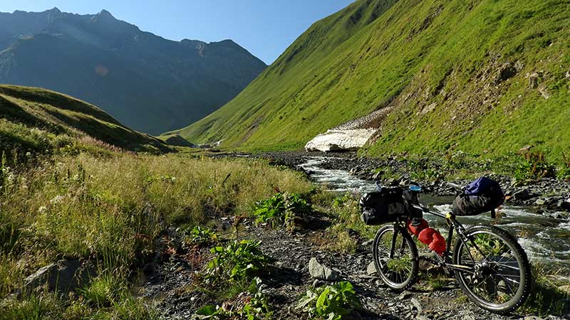 Am nächsten Tag weiter zum Sadzelisghele Pass. 1000 Höhenmeter auf etwas 10 Kilometern... Die Piste ist zunächst gut, allerdings nur für etwa 4 Kilometer, dann war vor vielen Jahren einmal die Uferböschung abgebrochen und hat die Piste kaputt gemacht. Ab da, existiert nur noch ein Fußpfad... Ich schiebe, manchmal kann man fahren. Mehrere Flussdurchquerungen, einmal verliere ich die Wasserflasche im Fluss. Nur langsam komme ich bergauf voran.