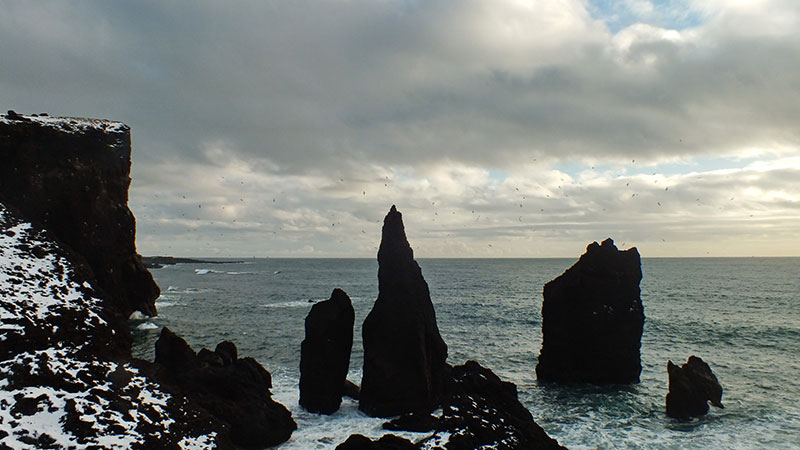 Ich fahre erstmal nach Süden und dann soll es der Küste entlang nach Osten gehen, irgendwann ein Stück ins Inland und später irgendwie wieder zurück. Die Straßen sind schneefrei, ich rolle gemütlich los. Allerdings passt mir die Gepäckverteilung noch nicht ganz optimal und ich bin zu warm angezogen… Ich bin begeistert von der verschneiten Lavalandschaft, schwarze Steine, weißer Schnee, im Hintergrund das blaue Meer. Ich mache unzählige Fotostops und schaue mir fast alle Infotafeln entlang der Straße zur Geologie und Geschichte an.