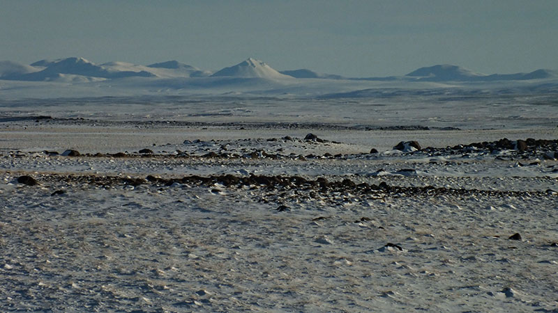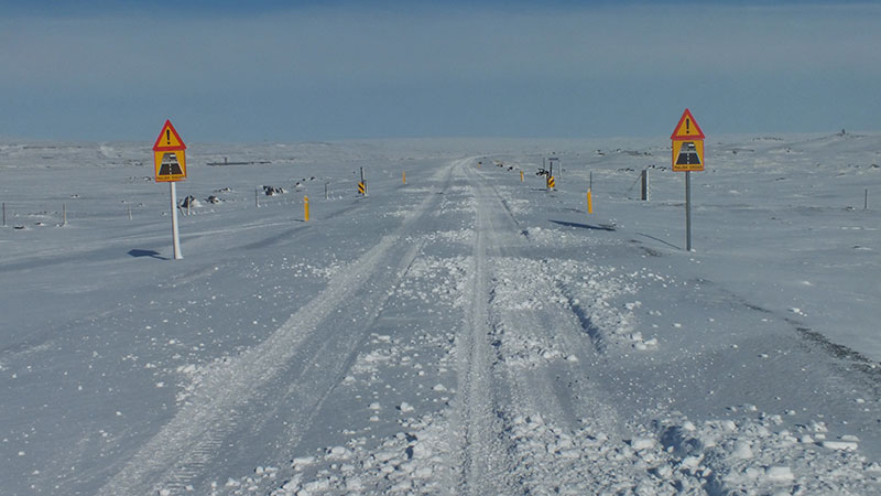 Ich begebe mich nun auf die F35, die Kjölur-Straße. Leider bläst immer noch ein starker Nordwind, so dass ich nur mühsam vorankomme. Die Landschaft ist faszinierend: weißer Schnee, dunkle Steine, blauer Himmel.