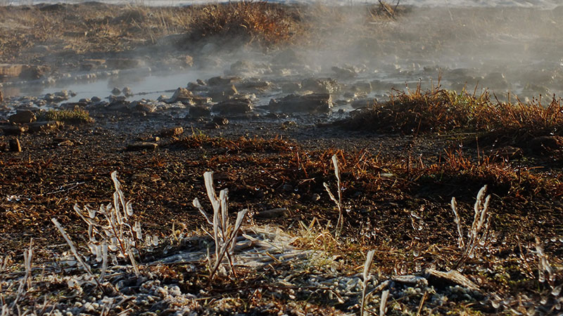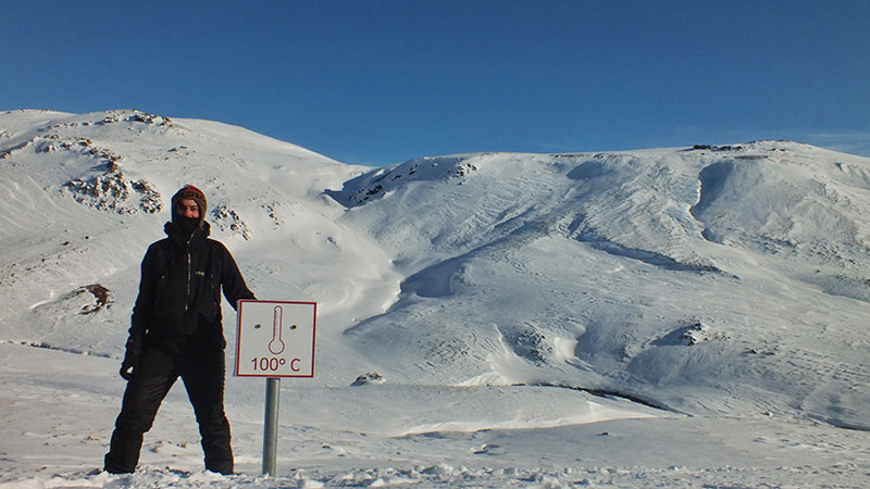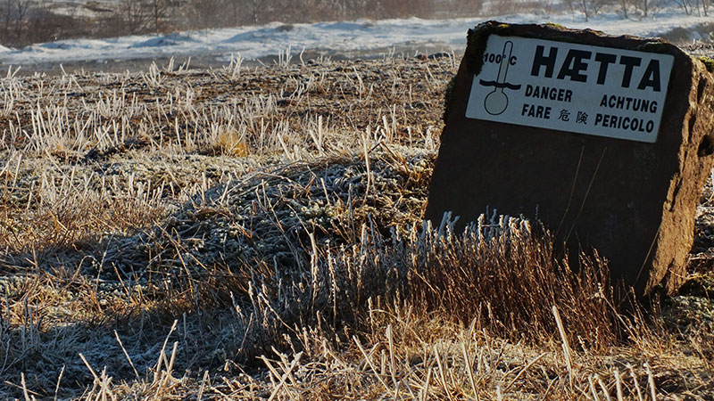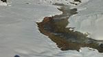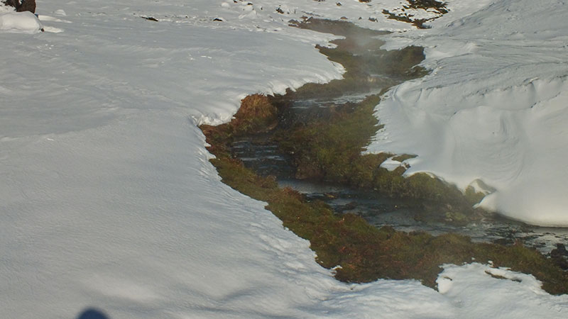 Dennoch stapfe ich über eine Stunde durch den Schnee über mehrere Bergrücken, bis endlich das Tal mit dem warmen Bach erreicht ist. In der Nähe gibt es noch einen kochend heißen Pool. Ein Schild im Schnee warnt davor, so dass niemand versehentlich im falschen Wasser badet.