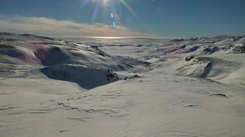 Einem Tipp von Einheimischen folgend möchte ich den heißen Bach bei Hveragerdi besuchen. Der Parkplatz mit dem Einstieg ist schnell gefunden, und dann sind es 3 Kilometer zu wandern. Eigentlich kein Problem, allerdings liegt knietiefer Schnee. Wie gut, dass ich nicht der erste und einzige Besucher bin, denn es führt bereits eine deutlich sichtbar ausgetretene Spur bergauf.