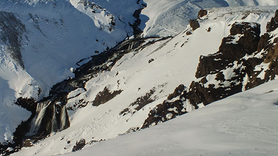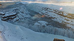 Der heiße Dampf aus den Geysiren kondensierte als Überzug aus Eis an den Gräsern und Bäumen und glitzert im Morgenlicht. Ich bleibe nicht lange und bevor die ersten Reisebusse ankommen bin ich schon wieder auf der Straße zum Gulfoss. Auch den Wasserfall schaue ich mir in Ruhe an, auch hier bin ich fast alleine. Das Wasser stürzt in eine Lavaspalte, Spritzwasser ist zu Eiszapfen gefroren. Rundum blicke ich auf die weißen Berge und freue mich, die nächsten paar Tage dort zu verbringen.