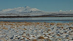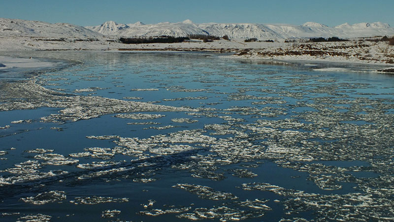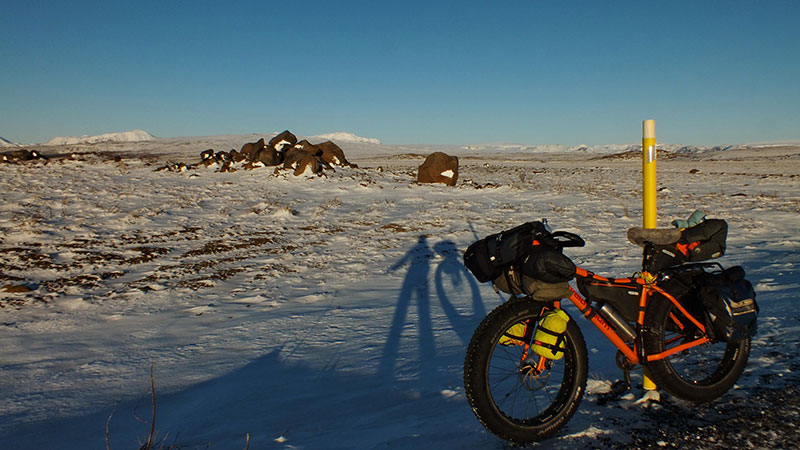 Am nächsten Morgen radle ich auf schneefreier Straße nach Norden. Die nächtlichen Schneewolken haben sich kurz nach Sonnenaufgang wieder aufgelöst und der Tag verspricht wieder gutes Wetter. Es ist schön kalt, auch auf dem Fluss Hvita haben sich Eisschollen gebildet.