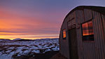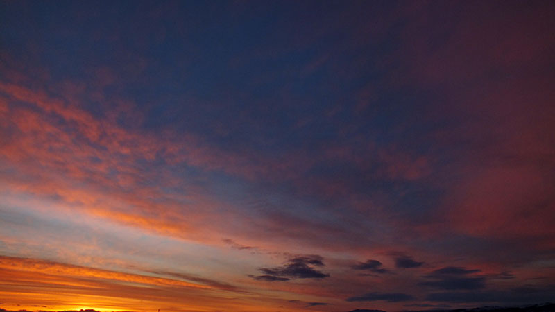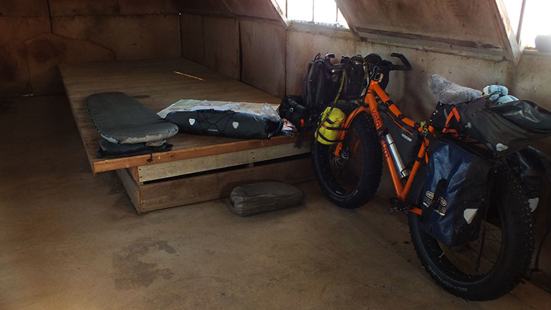 Etwas später, am Fluss Sanda entdecke ich eine Wellblechhütte. Irgendwie fühle ich mich müde bei dem Gegenwind und beschließe daher, in der Hütte zu bleiben. Innen ist es trocken, geräumig, windgeschützt, was will ich mehr. Zudem werde ich mit einem besonders spektakulär farbigen Sonnenuntergang belohnt. Es stürmt dann aber die ganze Nacht und ich bin wirklich froh, so einen komfortablen Windschutz zu haben.