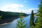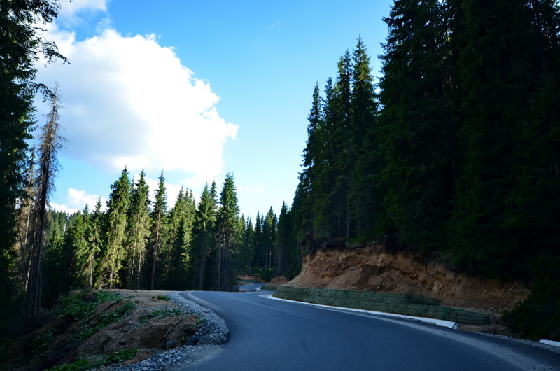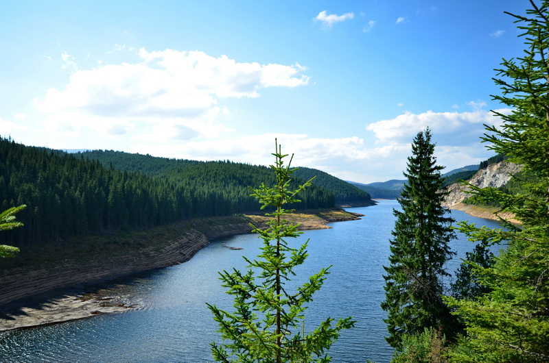 Im Dorf Jina hat die lange Steigung zunächst ein apbruptes Ende. Es folgt eine rasante Abfahrt in ein Tal, dem ich für den Rest des Tages dann wieder bergauf folgen werde. Die Straße im Sebes-Tal ist die "Transalpina" eine gut ausgebaute Teerstraße, die bis nach Novaci am Südrand der Karpaten führt. Die Straße ist gut zu fahren, ich komme zügig voran, obwohl es stetig bergauf geht. Einige Stauseen gibt es, erst Tau Bistra, dann Oasa Mica. Die Wasserspiegel sind niedrig, es zeugt von dem trockenen Sommer hier.