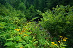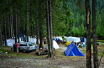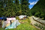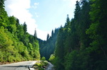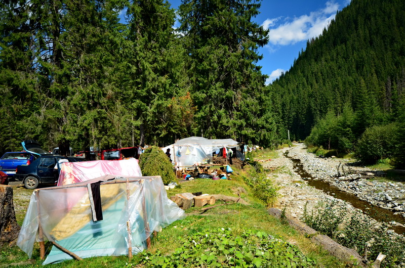 Kurz vor dem Vidra-See wird die Straße steiler, es geht über einen 1678m hohen Pass mit folgender, ebenso steilen Abfahrt dann hinab zum See. Hier am Seeufer dachte ich zunächst, einen schönen, ruhigen Übernachtungsplatz zu finden, aber die Rumänen zelten wohl auch gerne am Wochenende und so ist über Kilometeter jeder mögliche Platz am See und auch entlang des Lotru-Flusses bis aufs letzte Fleckchen belegt. Nicht nur Wochenend-Urlauber sind hier zu treffen, sondern auch 'professionelle' Beeren- und Pilzsammler. Es geht zwar weitgehend ruhig zu, aber dennoch ist mir nicht nach dieser Gesellschaft.