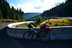Schließlich finde ich einen geeignten, ruhigen Übernachtungsplatz auf einer kleinen Almwiese in 1700m Höhe in Verlängerung einer Serpentine, sogar noch mit Abendsonne. Perfekt nach einem langen Radeltag: 140 km, 2410 Höhenmeter.