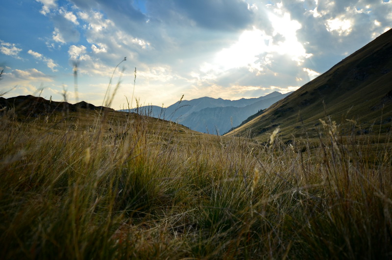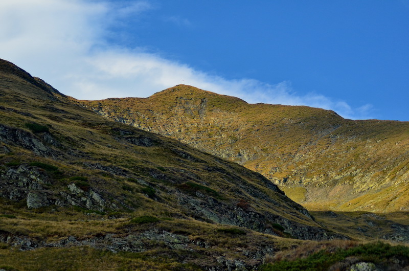 Ich übernachte in einem westlich offenen Kessel unterhalb des Moldoveanu mit Aussicht auf andere Berge des Fagaras, während der Gipfel des Moldoveanu noch lange die letzen Sonnenstrahlen einfängt.