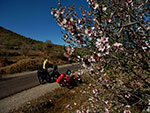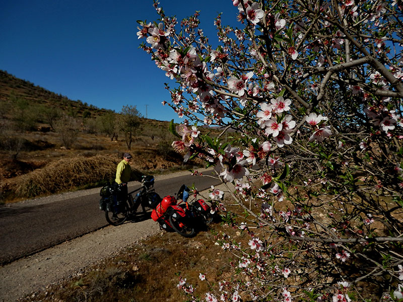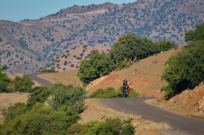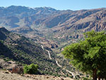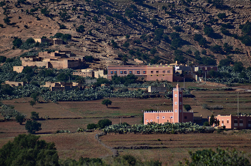 Über Biougra radeln wir hinauf nach Ait-Baha. Sehr schöne Panorama-Straße, mit Blicke auf den verschneiten Hohen Atlas im Norden. Von Ait-Baha geht es dann auf die landschaftlich hübsche Straße entlang/oberhalb des Flusstals des Ait-Baha. Es ist ein kleines Sträßchen mit welligem Profil, tendenziell bergauf, aber immer wieder mit grandiosen Blicken in das Tal. Die Vegetation ist dominiert von Arganien-Bäume und diverse sukkulente Euphorbia-Gewächse.