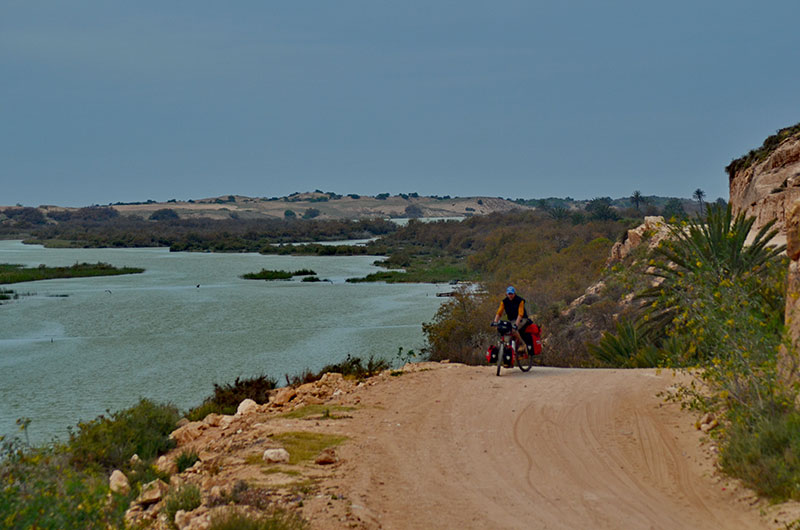 In Ait Milk können wir wieder einkaufen (Gemüse und Orangen) und biegen in Richtung Had-Belfa direkt nach Westen ab. Tendenziell fahren wir immer weiter bergab – heute wollen wir ja das Meer erreichen. Und Rückenwind haben wir auch wieder einmal... Nun radeln wir wieder entlang von landwirtschaftlichen Gemüseanbauflächen. Dazwischen gibt es immer wieder Getreidefelder, Olivenhaine und kleine Ortschaften. Nur kurz fahren wir auf der N1 nach Norden, biegen in Had-Belfa auch schon wieder nach Westen ab, in Richtung Sidi Rabat. In Massa gibt es nochmal Einkaufsmöglichkeiten. An der Weggabelung fahren wir nach rechts und an der nächsten Weggabelung links (geradeaus geht es zur Ortschaft Sidi Rabat). Wir erreichen den Nationalpark Massa, der sich beiderseits des Ufers des gleichnamigen Flusses erstreckt.
