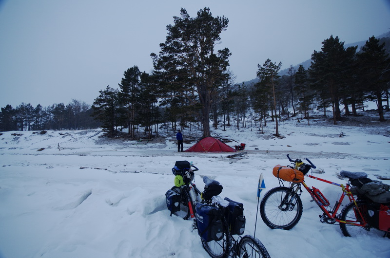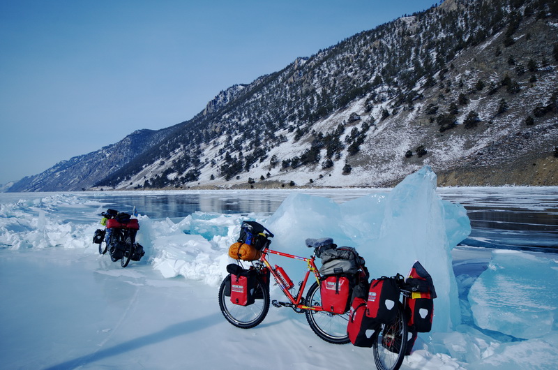 Our daily mileage varied from 25 kilometers to 55 kilometers depending on ice and snow conditions. Best cycling conditions we found south of Ust Bargusin and near Olchon Island, where there was almost no snow cover on the lake and we were able to cycle on blank ice in any direction. For that, our bikes were equipped with studded tires, which gave us good grip even on blank ice surfaces. These days with riding on the blank ice were pure joy and gave us a great feeling of freedom.