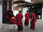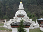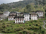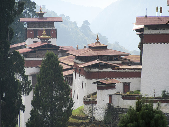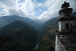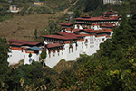 Der mächtige Dzong von Trongsa ist schon zum Greifen nahe aber doch noch fast eine Stunde entfernt. Gegen Mittag erreiche ich das Hotel am Ortseingang. Pünktlich dazu reißt der Dunst auf und es wird ein sonniger Tag. Ideal, um die Kleinstadt und die bekannte Festungsanlage zu erwandern und Fotos zu machen. Es ist der wohl beeindruckenste Dzong in Bhutan. Auf einem kleinen Hügel weit oberhalb des mächtigen Mangde Chhu konnte dieser Dzong nur sehr schwer erobert werden. Zusätzlich konnten von hier alle Bewegungen auf den Wegen und Pfaden, seien es Truppen oder Handelskarawanen, beobachtet werden. Ich schlendere die Hauptstraße entlang und wundere mich, dass diese Distriktzentrale so klein ist. Es gibt einige Geschäfte, Restaurants und lokale Hotels, einen Internet-Laden, eine Bank, die Post und eine große Schule. Alle Gebäude sehen aus wie an den steilen Hang geklebt. Die breite Hauptstraße gabelt sich mitten im Ort – ein Arm führt weiter Richtung Osten, der andere nach Thimphu. Eine schmale Asphaltstraße führt hinunter zum Dzong. Ich gehe die Treppen hoch zum großen Eingangsportal des Dzong und betrete den ersten Innenhof. Die bunten Holzschnitzereien und Malereien sind beeindruckend. Die miteinander verschachtelten Gebäude und die Ausmaße des gesamten Gebäudekomplexes bekomme ich trotz Weitwinkelobjektiv gar nicht in die Kamera. Einige wenige Tempel kann ich zwar anschauen, darf dort aber leider nicht fotografieren. Mindestens eine Stunde laufe ich Treppen hinauf und hinunter, erklimme Leitern, schaue in enge Gassen und Gänge und spitze vorsichtig in fast jede offene Tür hinein. Inzwischen ist es Mittag und recht warm geworden und ich strebe wieder in Richtung Ortschaft und kühler Getränke.