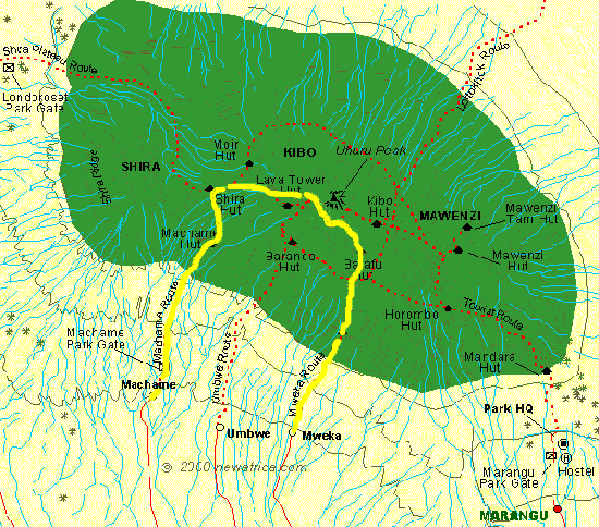 It is a camping route, the few shelter huts are for the porters. The ascend of the steep trail starts in Machame and leads through the rain forest and Erica arborea zone to the camp Shira Plateau (3800 m). It is possible to camp at the upper tree line of the rain forest at about 3000 m. From the Shira Plateau one ascends to Arrow Hut (4900 m). It is not steep, but the altitude is high!! Arrow Hut is the last camp before the summit. The name, however, is misleading - the shelter hut got destroyed by falling rocks.