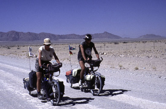By taking the train we saved a lot of time we would have had to spend on a straight paved road with a lot of truck traffic. In Keetmanshoop we visited the Quilvertree forest and the rode on the the Fish River Canyon. From there we took the gravel road to Noordoewer at the South African boarder. From Noordoewer we took a small gravel road along the Orange River to Rosh Pinah. These 160 km along the river were among the nicest impressions we got during the trip. From Rosh Pinah we again traveled north to the town of Aus. From there we rode back to Windhoek taking the sand-gravel-road along the Namib Desert via Helmeringhausen, Sesriem, and Solitaire.Before reaching Windhoek we had to cross the Gamsberg Pass, the road leading to it definitely was the worst we rode on. After two and one half months we were back to civilization...
